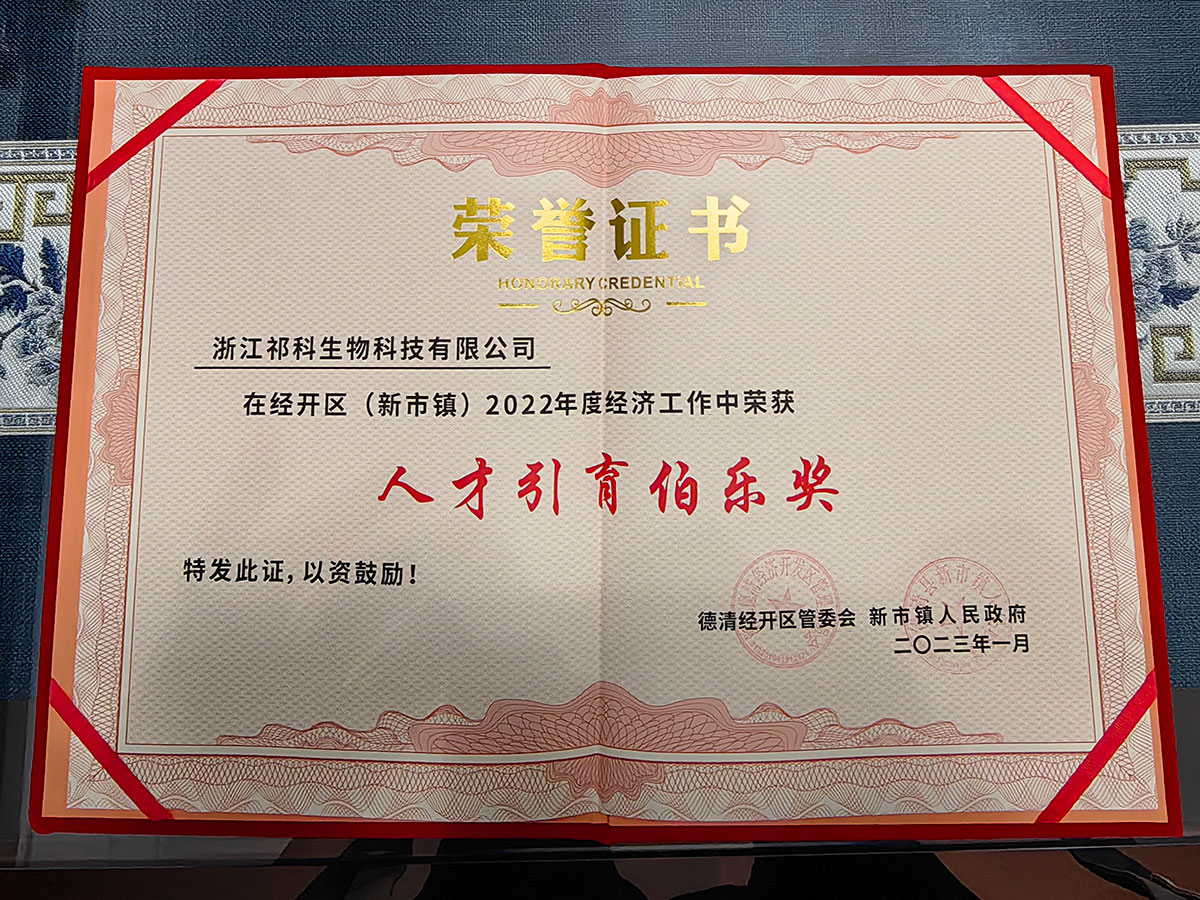 在县委县政府坚强领导下,在经开区(新市镇)关心支持下,浙江祁科生物科技有限公司“在湖州看见美丽中国”实干争先实践期间,荣获2022年度“企业做大做强奖”、“科技创新新苗奖”和“人才引育伯乐奖”,表彰我司围绕国家政策在技术创新,人才引进培养中所做出的卓越贡献。随着“在湖州看到美丽中国”强大号召力下,浙江祁科生物有限公司将秉承“科技创新、人才至上、真抓实干、奋勇拼搏”精神,进一步引进高层次人才,发挥技术优势,真正实现高质量发展,为德清经济发展作出微薄贡献。