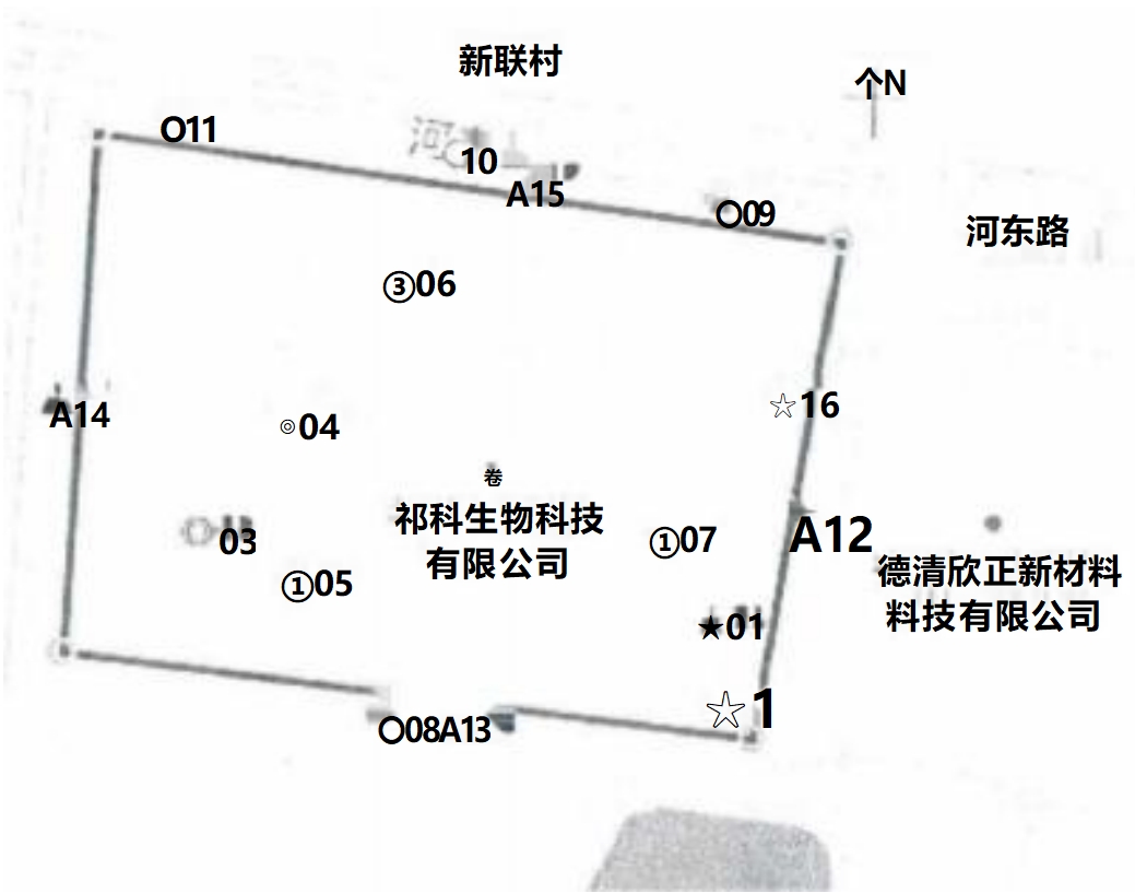 注: “☆”-地下水采样点; “★”-废水采样点; “O”-无组织废气采样点; “◎”-有组织废气采样点; “▲”-工业企业厂界环境噪声检测点。 |